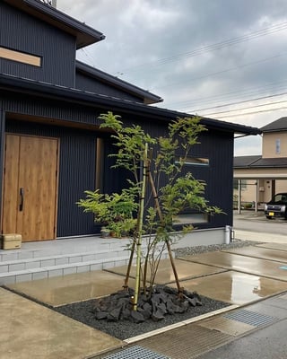 シンボルツリーの植え込みには石組みをしました。外壁に合わせて落ち着いた色にし、重厚さと洗練された雰囲気が建物を一層引立たせていますね。