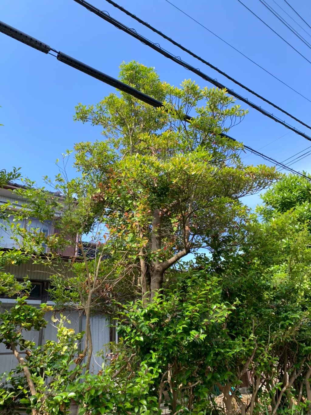 家にもたれかかるように伸びていたカシ、モチの木を伐採