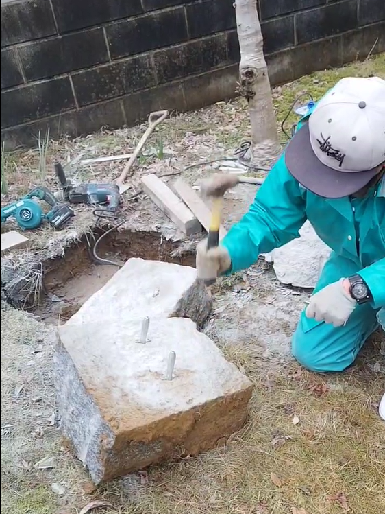 まず、石にドリルで穴をまっすぐ平行に開けます。